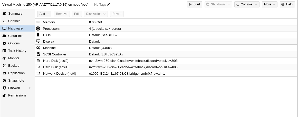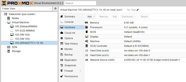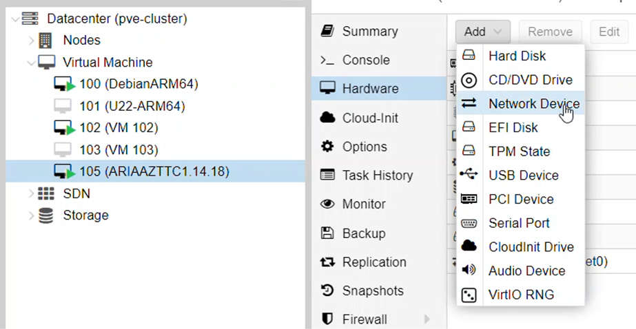 - Open the Proxmox GUI, then navigate to VM > Hardware.