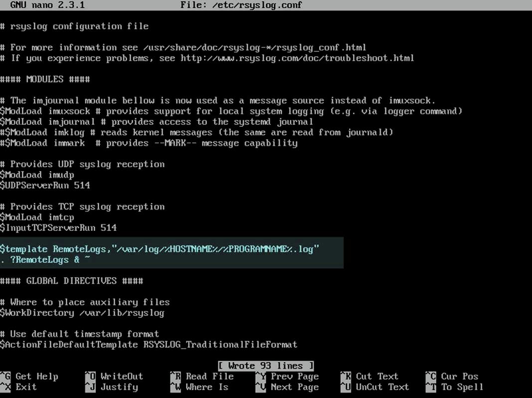 In the next step, don’t close the file yet. Create a new template that will be used for receiving remote messages. This template will instruct the local Rsyslog server where to save the received messages sent by Syslog network clients. The template must be added before the beginning of the GLOBAL DIRECTIVES block as illustrated in the below excerpt.
